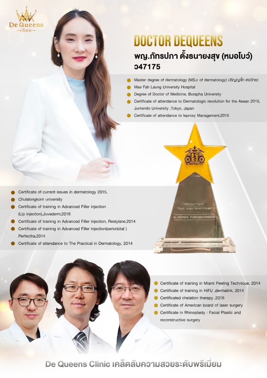 เดอควีนส์ คลินิก สถาบันดูแลด้านสุขภาพความงาม และผิวพรรณ ระดับพรีเมี่ยม รวมถึงการให้บริการด้านศัลยกรรมตกแต่งด้วยทีมแพทย์เฉพาะทางการให้บริการของคลินิกจะเน้นในด้านความงาม บนพื้นฐานสุขภาพที่ดีและปลอดภัย ลูกค้าจะได้รับคำตอบที่ตรงปัญหา จากทั้งทีมแพทย์และทีมผู้แนะนำที่ดูแลแบบใกล้ชิดตัวต่อตัว จนเข้าใจเรื่องพื้นฐานของตัวเอง และนวัตกรรมที่เป็นการต่อยอด ทั้งด้านผิวพรรณให้ดูอ่อนกว่าวัย รวมถึงการให้บริการด้านศัลยกรรมตกแต่งด้วยทีมแพทย์เฉพาะทาง